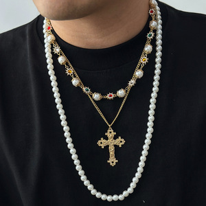 3 cái/bộ sáng tạo Rhinestone giả ngọc trai Chuỗi vòng cổ cho nam giới Goth lớn Jesus Chéo Mặt Dây Chuyền Choker Y2K đồ trang sức quà tặng (nl800)